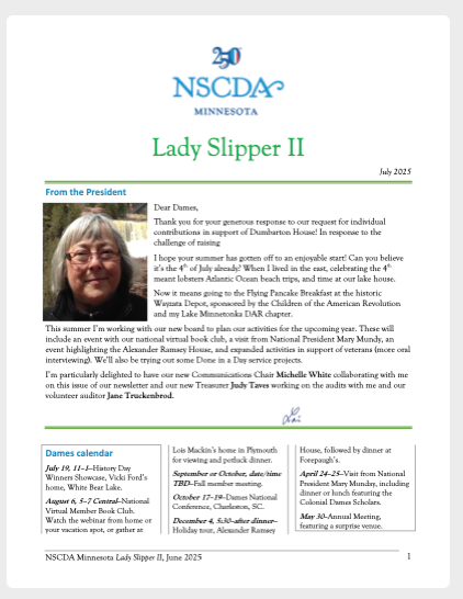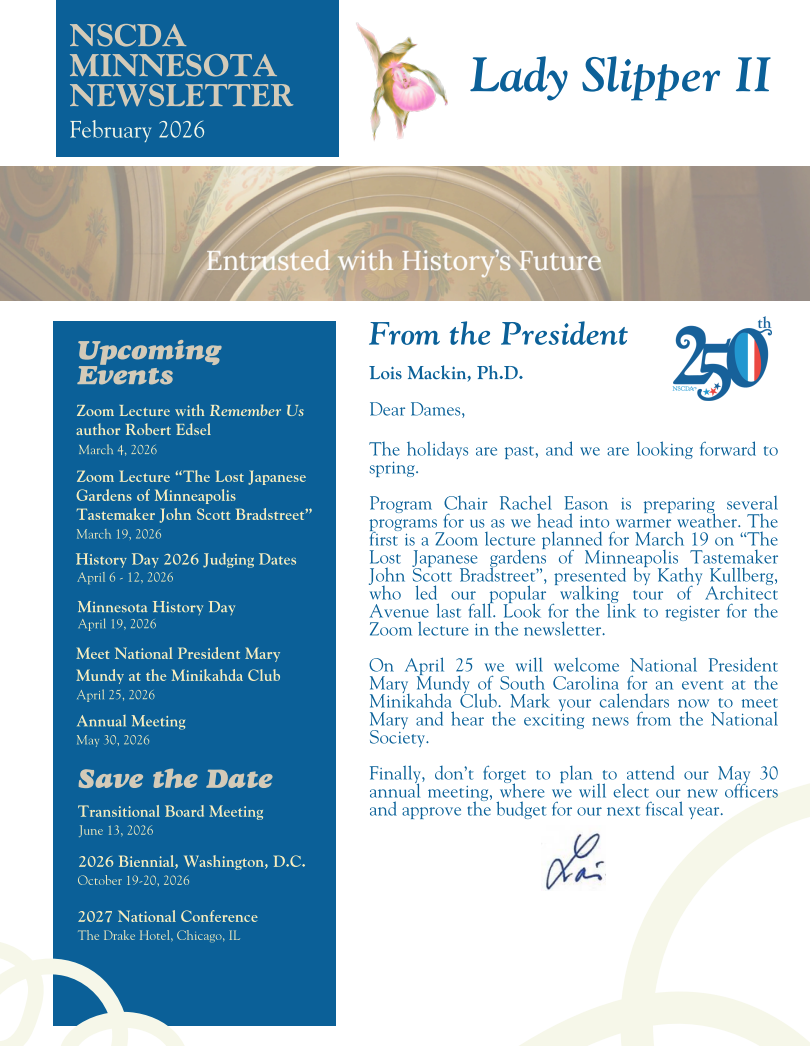 This issue features our event to host National NSCDA president Marcy Moody, a Ramsey House retrospective, and remembering Mary Lee Dayton.